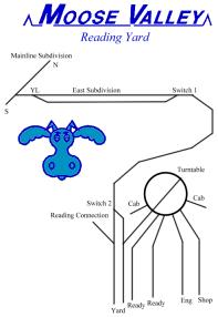 A NEW YARD AT THE EASTERN TERMINUS OF THE EAST SUBDIVISION HAS BEEN ESTABLISHED TO ENHANCE CONNECTIONS WITH THE READING RAILWAY COMPANY AT CARLISLE PENNSYLVANIA. THE NEW YARD IS CALLED "READING YARD". CREWS ARE ENCOURAGED NOT TO CONFUSE THE MOOSE VALLEY READING YARD WITH THE READING RAILWAY'S OWN "CARLISLE YARD" AT CARLISLE. THE MOOSE VALLEY HAS ENTERED INTO AGREEMENT WITH THE READING COMPANY TO PERFORM OPERATIONS JOINTLY AT THESE TWO FACILITES, WITH BOTH READING AND MOOSE VALLEY CREWS PERFORMING THE NECESSARY SWITCHING ACTIVITIES. DIAGRAMS OF BOTH FACILITIES ARE BELOW. NOTE THAT THE READING YARD YARDMASTER WILL CONTROL THE EAST END OF THE EAST SUBDIVISION IN ADDITION TO THE YARD. MAINLINE TRAINS ENTERING THE EAST SUBDIVISION WILL REQUIRE FORM-D PERMISSION FROM THE READING YARD YARDMASTER WHEN ENTERING THE EAST SUB. TRAINS LEAVING THE EAST SUB WILL REQUIRE PERMISSION FROM THE VALLEY DISPATCHER AS NORMAL.