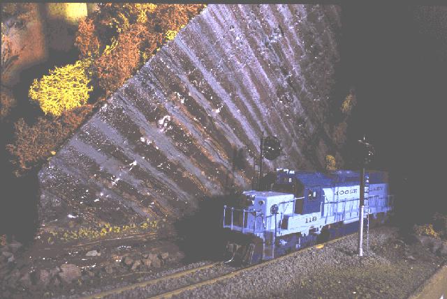 Hot Springs tunnel - Located just South of New Windsor, PA. is the second longest on the Moose Valley and on the same 2% grade as Cowan tunnel. Here at the North portal, smoke becomes a major problem as heavy coal drags fight the tug of gravity. Once units drop below 10MPH, the Smoke thickens as diesels begin to regurgitate their exhaust. For this reason, the Moose Valley is purchasing former Southern Pacific SD-40T-2's like this one, seen leading MV20-U, a unit coal train out of Weeter Mine#2 at Greenspring, WV., bound for New York Power and Light in Buffalo.